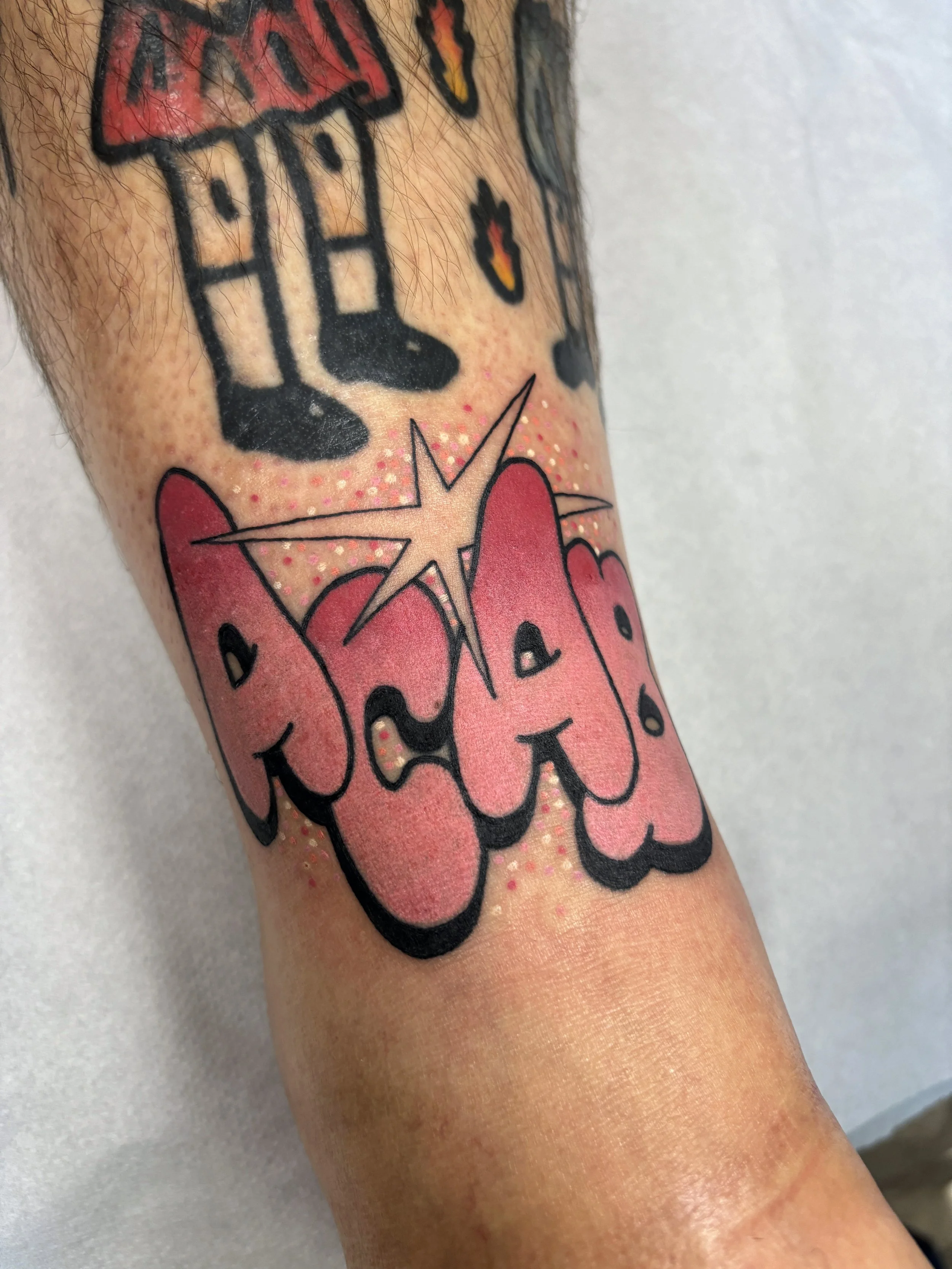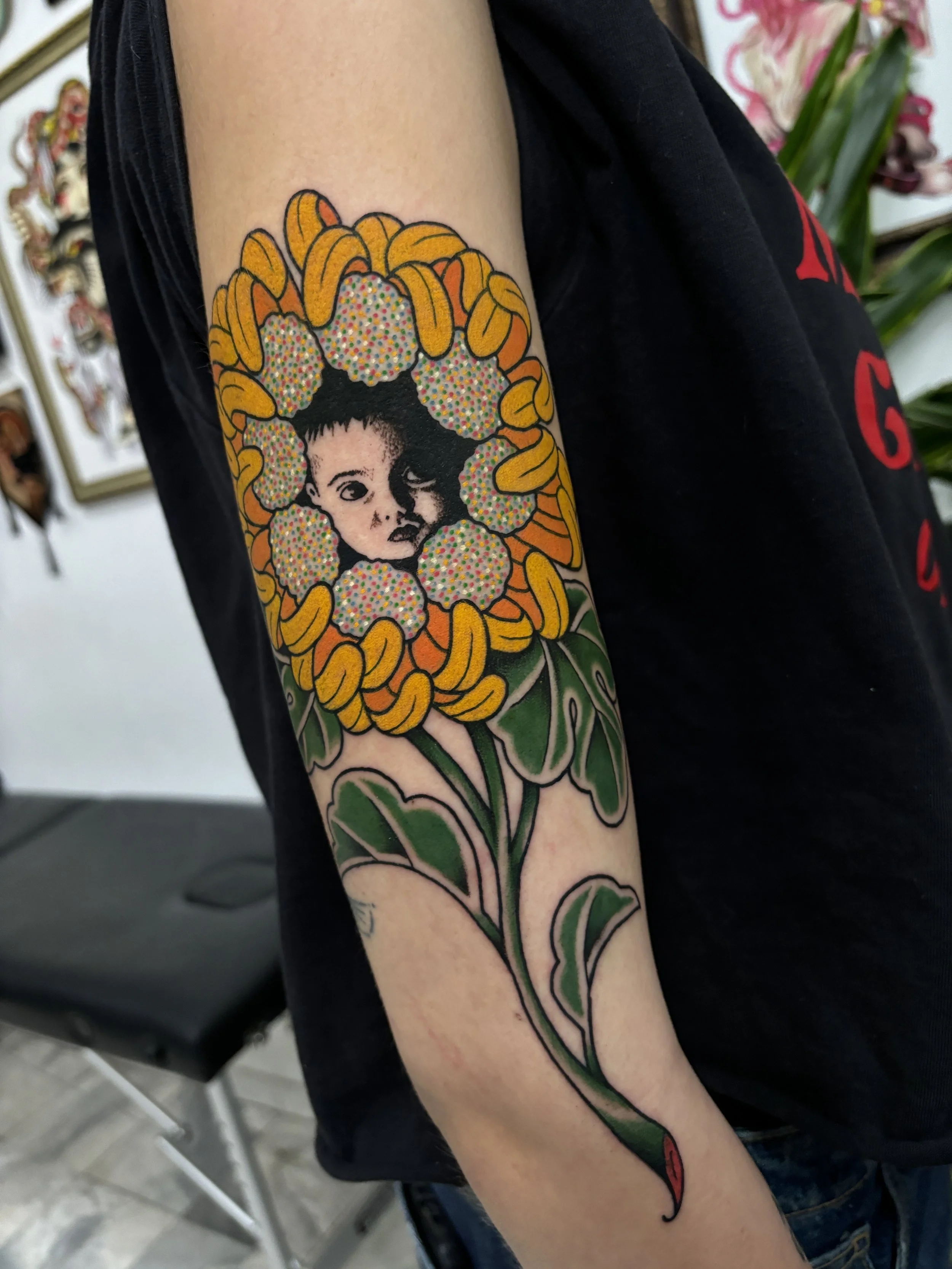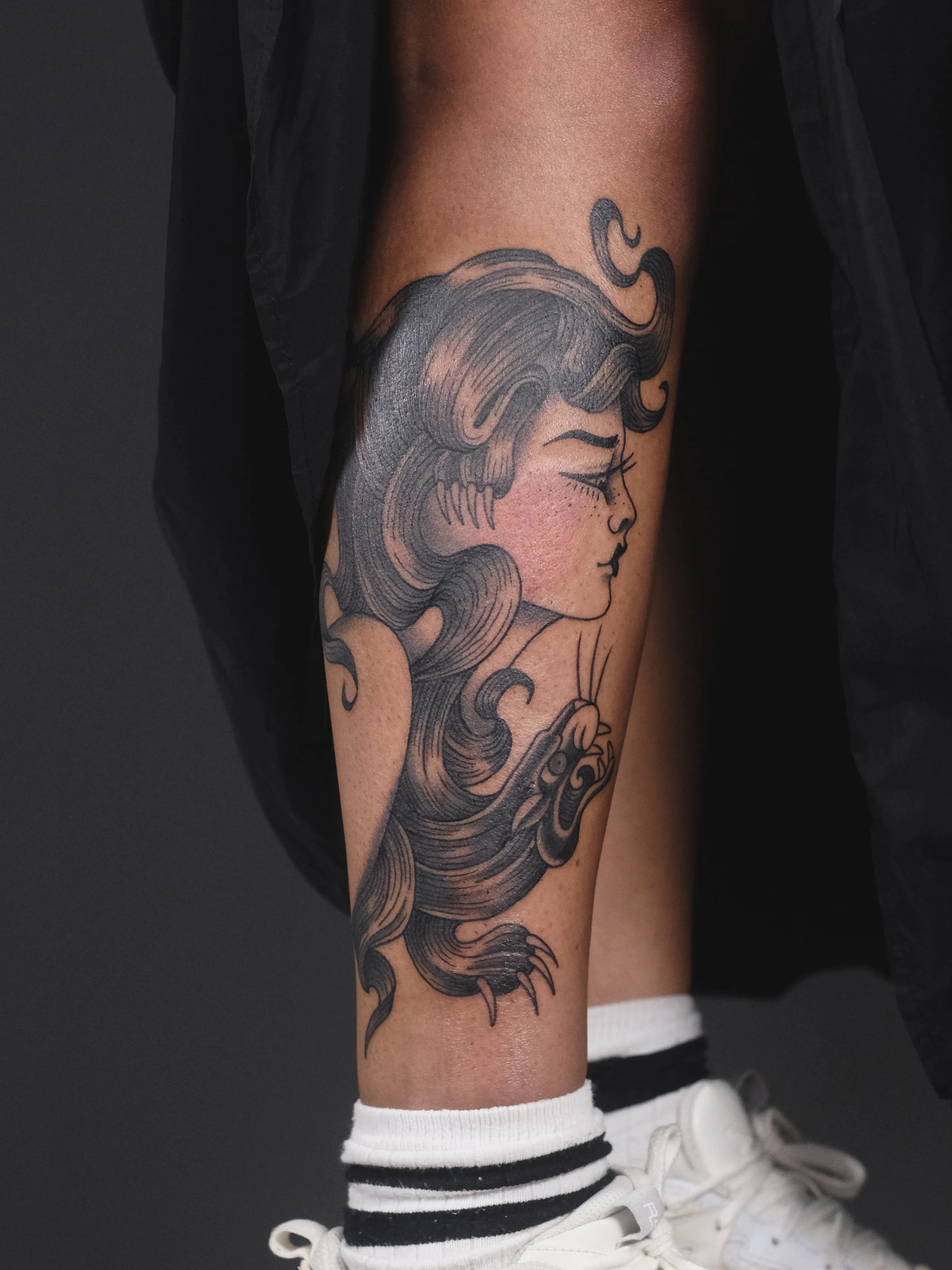 Inspired by traditional tattooing Ely adds her sense of humor and unique perspective in her drawings. It’s better to not talk with her while she do the lines. She tattoos since 2017. Also check the Store section for her unique rug pieces.